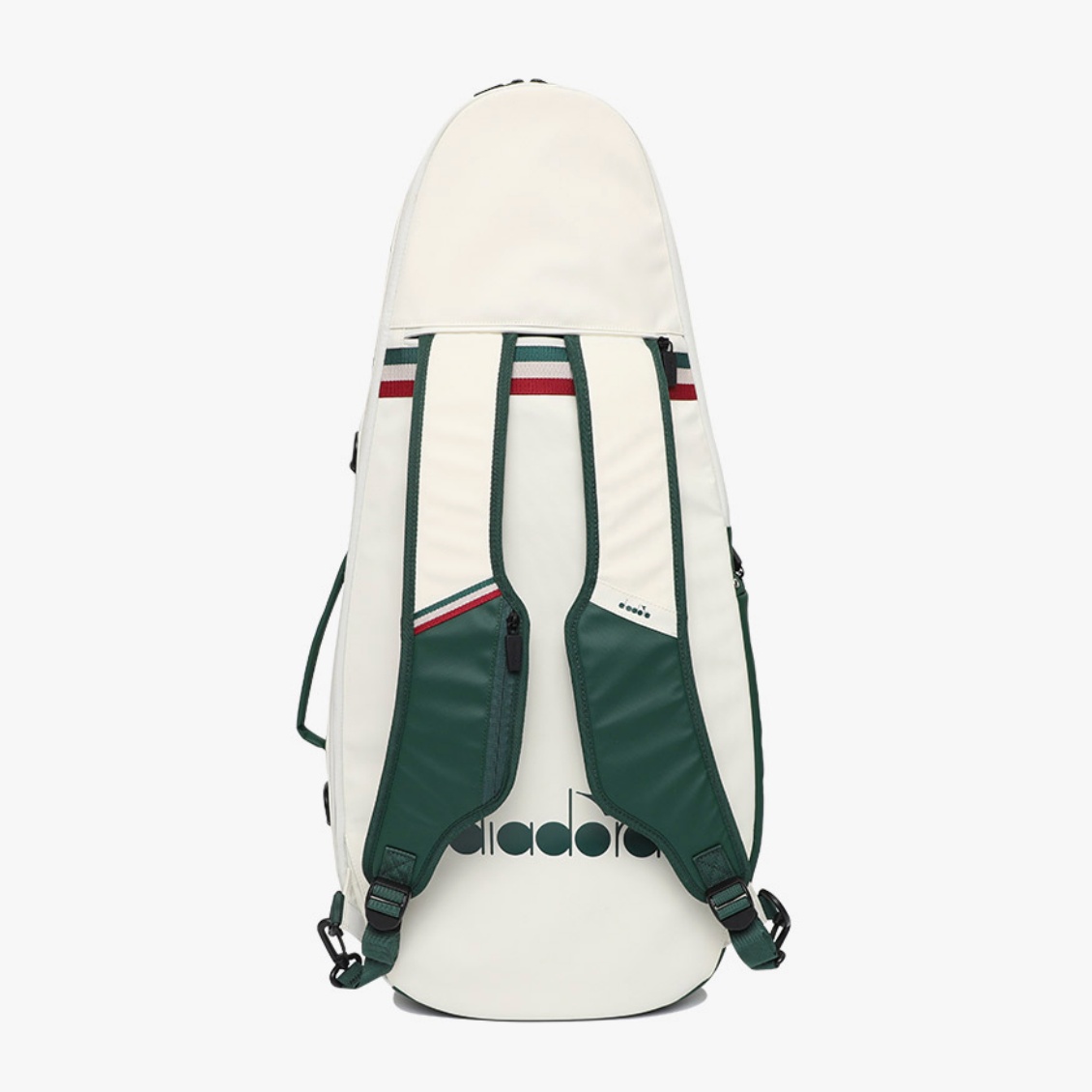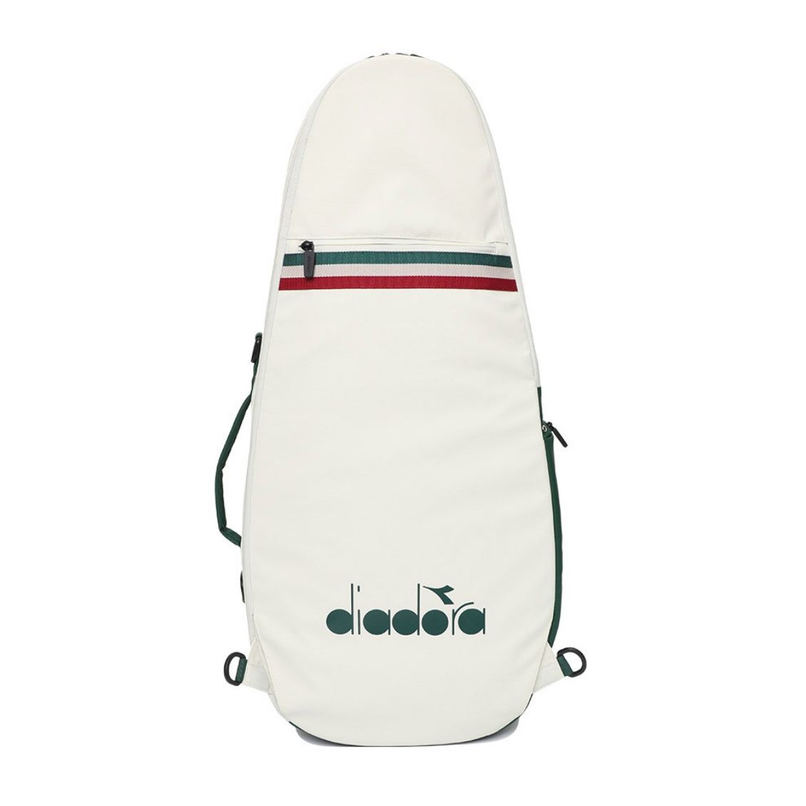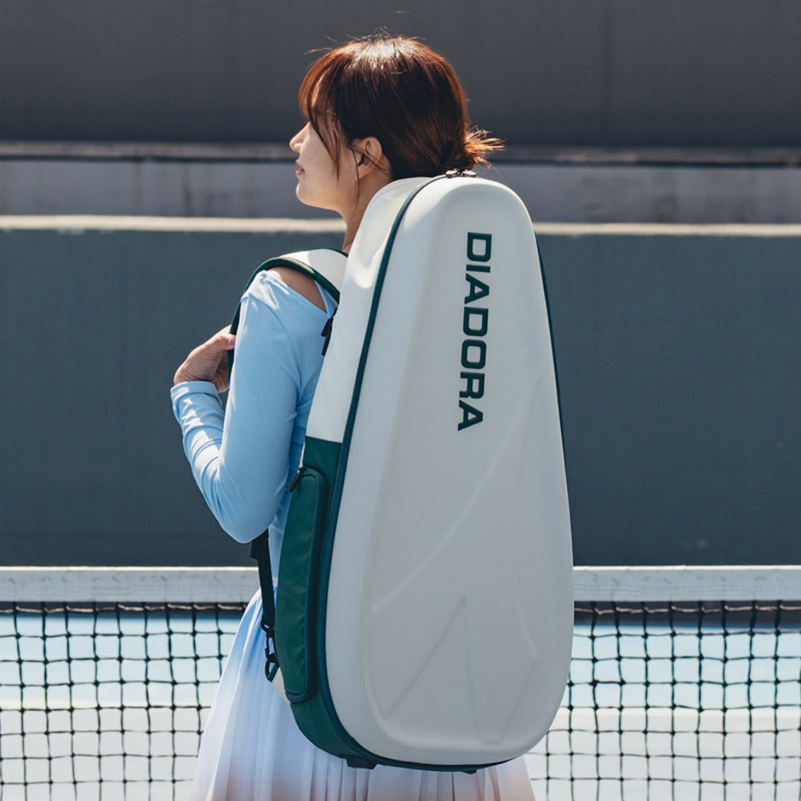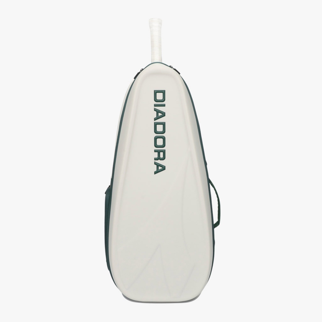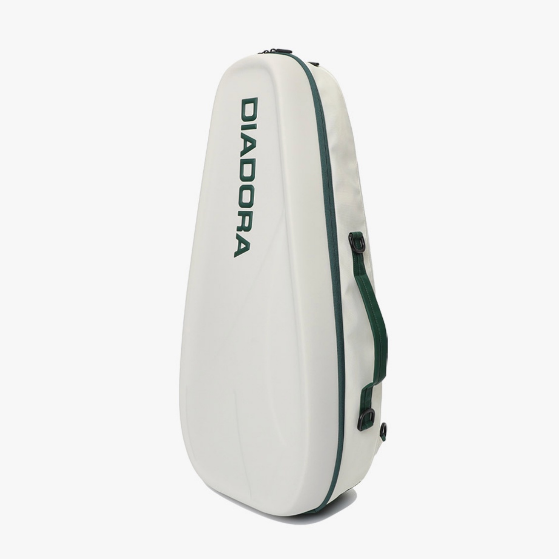 เป็นกระเป๋าแบบ Hard Shell ที่ป้องกันแร็คเกตได้ทั้งใบแบบ Full Shield สามารถปรับเป็นแบบ 2-Way โดยมีรายละเอียดสายสะพายที่ถอดได้ ด้วยวัสดุ โพลีคาร์บอเนต (Carbonate) ที่มีความทนทานสูงและดูแลรักษาง่าย ซึ่งช่วยรักษาสภาพแร็คเกตให้อยู่ในสภาพที่ดีที่สุดเสมอ ส่วนล่างของผลิตภัณฑ์มีแผ่นรอง (Pad) เพื่อให้ตัวกระเป๋าสามารถตั้งได้ (Self-standing) และป้องกันมลพิษ/การปนเปื้อน (จากพื้น) แนะนำให้เก็บแร็คเกตได้สูงสุด 3 ไม้ สามารถเก็บแร็คเกต, รองเท้า, และสิ่งของส่วนตัวอื่นๆ แยกกันได้อย่างเป็นระเบียบ ด้วยรายละเอียดสายรัด (Webbing) ที่มีโลโก้ปักนูน (Embossed) ที่ดูหรูหรา และสีสันมรดก (Heritage Colors) ของ Diadora ช่วยเสริมลุคสปอร์ตคลาสสิกในแบบฉบับของ Diadora